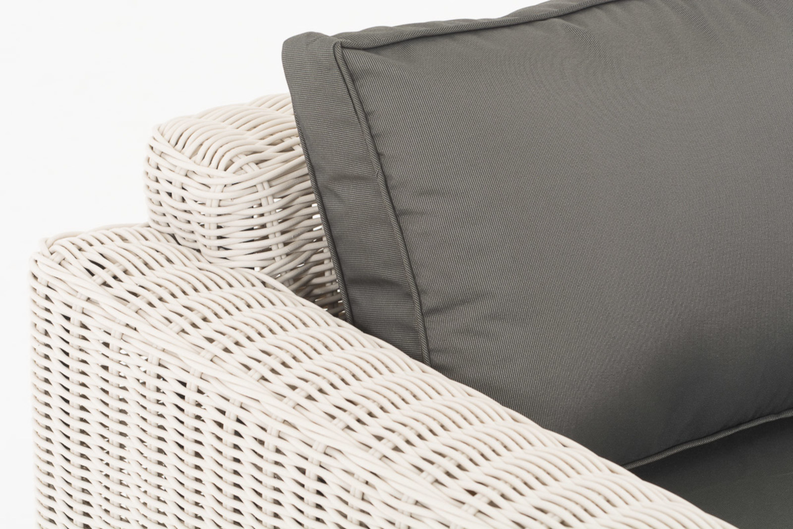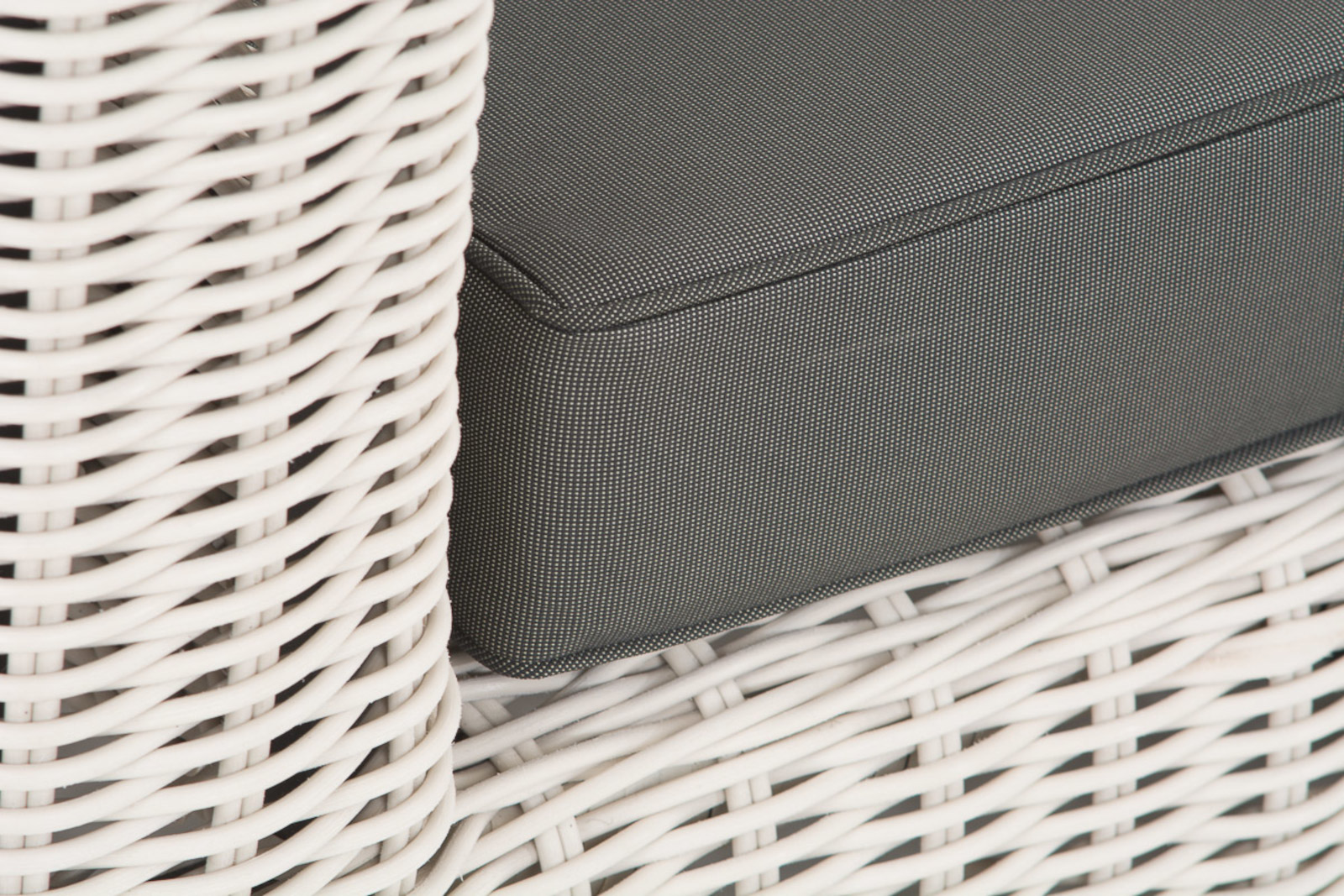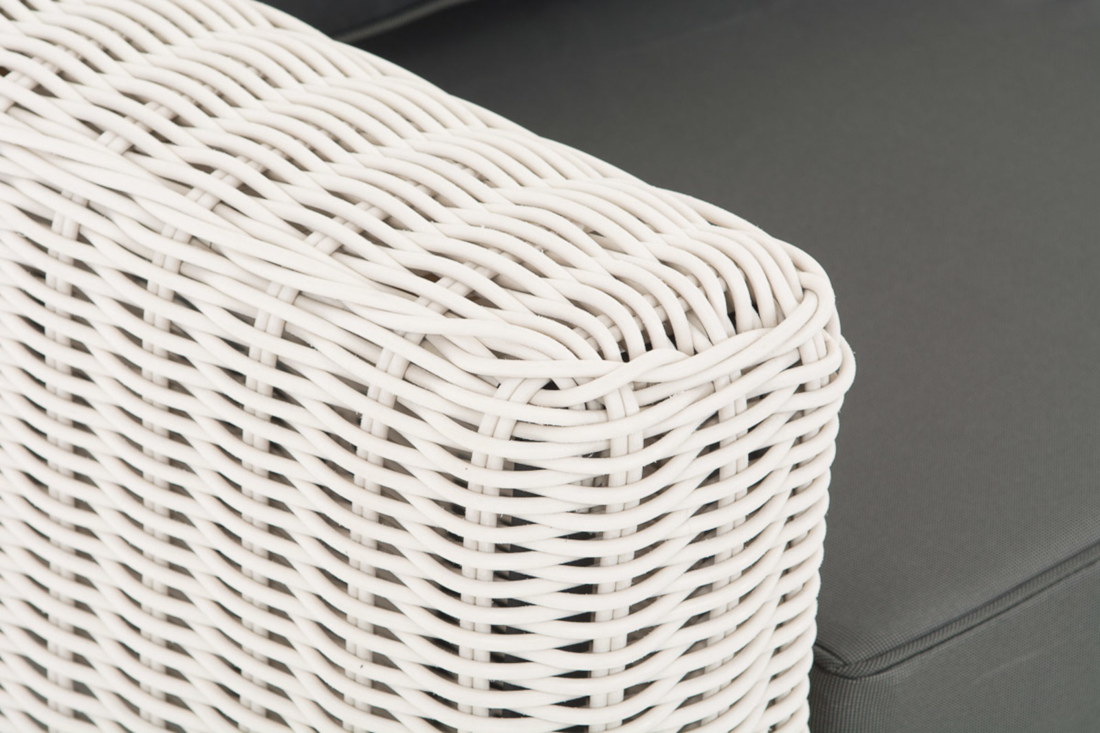 Das besonders gut für die Verwendung im Außenbereich geeignete UV-beständige Material Polyrattan sieht aus wie herkömmliches Rattangeflecht, ist aber viel robuster. Die hochwertig verarbeiteten 5 mm dicken, runden Polyrattanfasern sind wasserfest, angenehm pflegeleicht und vollständig durchgefärbt, sodass sie auch bei häufiger und langjähriger Nutzung unverändert ihre grau melierte Farbtiefe behalten. Dieser edle Farbton sorgt in Kombination mit einer leichten Struktur für das absolut natürliche Erscheinungsbild der Möbelgarnitur.