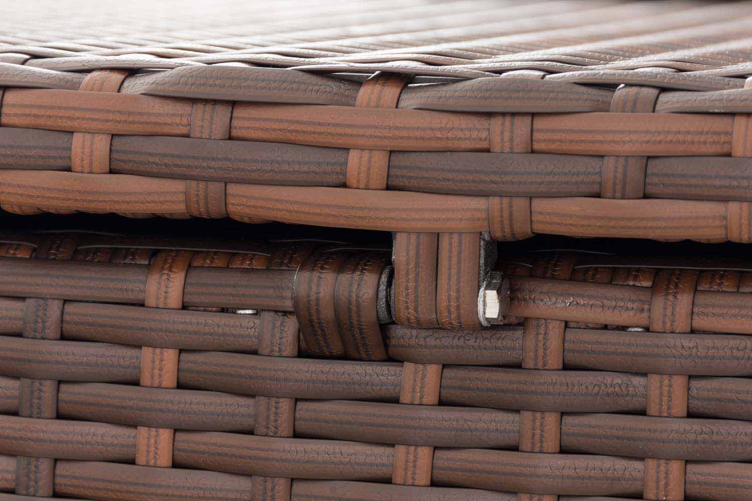 Diese Gartentruhe besteht aus hochwertigem Polyratten. Dieses Kunst-Geflecht lässt keine Feuchtigkeit einziehen, sodass es absolut wetterbeständig ist. Darüber hinaus ist es sehr UV-beständig. Das Gestell besteht aus pulverbeschichtetem Aluminium, rostet also nicht. Damit das Gestell auch stabil und langlebig ist, sind Verbindungsstellen vollgeschweißt.