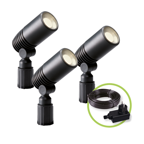 Das Alder Set besteht aus 3 Alder-Leuchten. So ist Ihr Garten sofort optimal beleuchtet. Die 12-Volt-Lampen bestehen aus schwarzem Kunststoff. Alle drei Leuchten haben einen niedrigen Fuß. So können die Spots auf jede Höhe ausgerichtet werden. Das Set lässt sich leicht anschließen, ein 8 Meter langes Kabel wird mitgeliefert. Sie stecken die Leuchte ganz einfach in den Boden und verbrauchen nur 2 Watt: sehr sparsam!