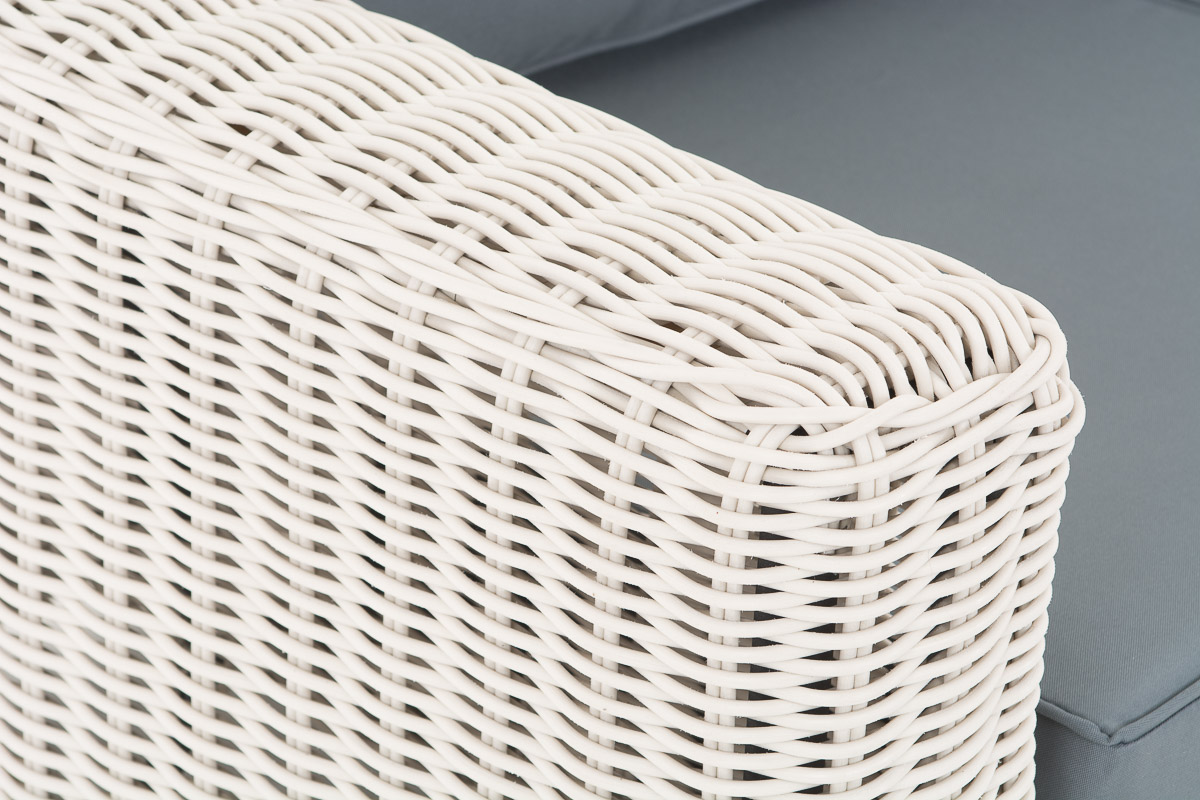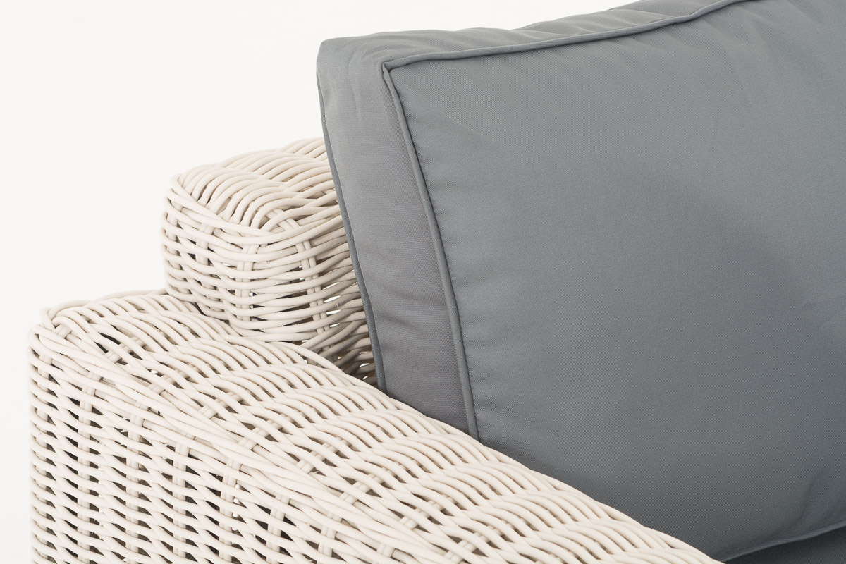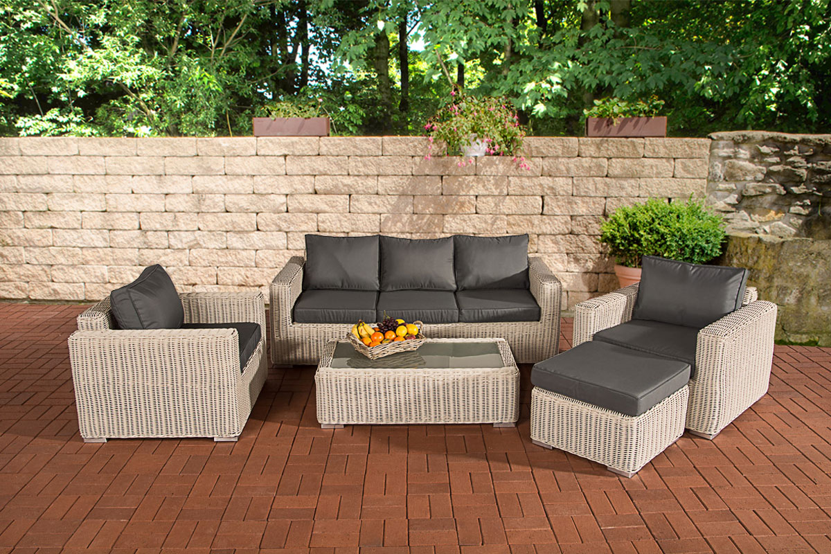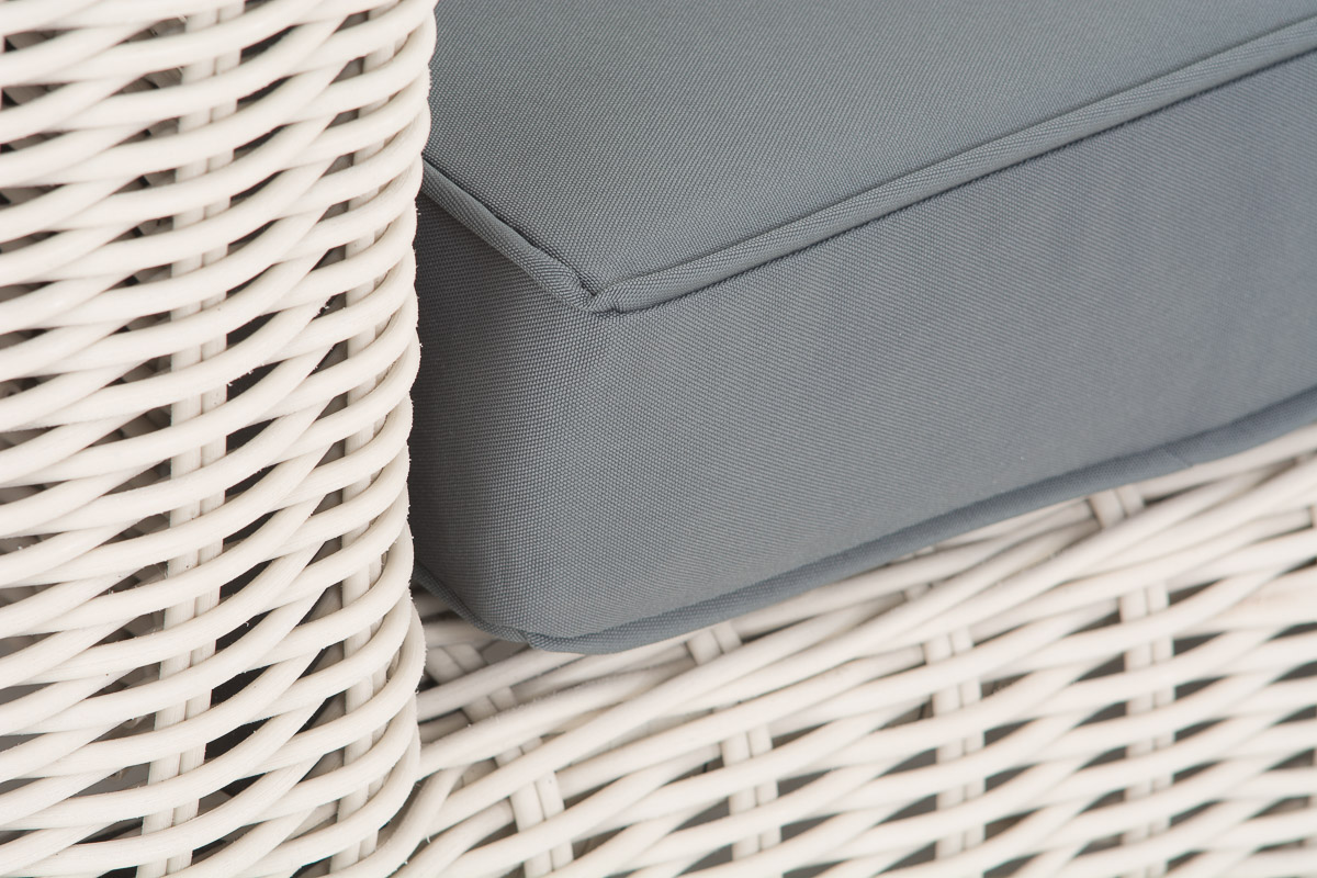 Diese exklusive Garnitur erfüllt nicht nur optisch höchste Ansprüche – auch die in Handarbeit verwendeten Materialien entsprechen besten Qualitätsstandards und gewährleisten Stabilität und Langlebigkeit. Das besonders gut für die Verwendung im Außenbereich geeignete UV-beständige Material Polyrattan sieht aus wie herkömmliches Rattangeflecht, ist aber viel robuster. Die hochwertig verarbeiteten 5 mm dicken, runden Polyrattanfasern sind wasserfest, angenehm pflegeleicht und UV-beständig, sodass sie auch bei häufiger und langjähriger Nutzung unverändert ihre Farbtiefe behalten. Dieser edle Farbton sorgt in Kombination mit einer leichten Struktur für das absolut natürliche Erscheinungsbild der Möbelgarnitur. Die bequemen dicken Sitz- und Rückenkissen sind mit Bezügen aus 100 % Polyester versehen. Diese sind wasser- sowie schmutzabweisend und durch ihre hohe Strapazierfähigkeit sehr lange haltbar. Dank der verdeckt eingenähten Reißverschlüsse lassen sich die Bezüge bei Bedarf einfach abnehmen und waschen. Der Rahmen bzw. das Untergestell der einzelnen Möbelstücke ist aus stabilem, pulverbeschichtetem Aluminium gefertigt – garantiert stabil und dauerhaft rostfrei.