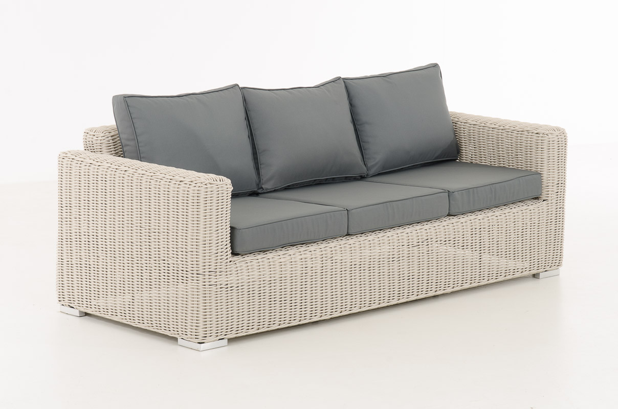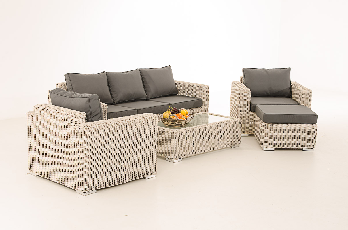 Ein 3-Sitzer Sofa, zwei Sessel, Tisch und ein gepolsterter Hocker – das Set Madeira 3-1-1 bietet eine allseits beliebte Sofa – Sessel – Tisch – Kombination. Die Elemente können jeweils einzeln gestellt werden und bieten somit höchste Flexibilität, je nachdem, wo eben Sitzmöglichkeiten benötigt werden. Die besonders dicken Sitz- und Rückenkissen, sowie die leicht erhöhte Rückenlehne, sorgen für einen sehr angenehmen Sitzkomfort.