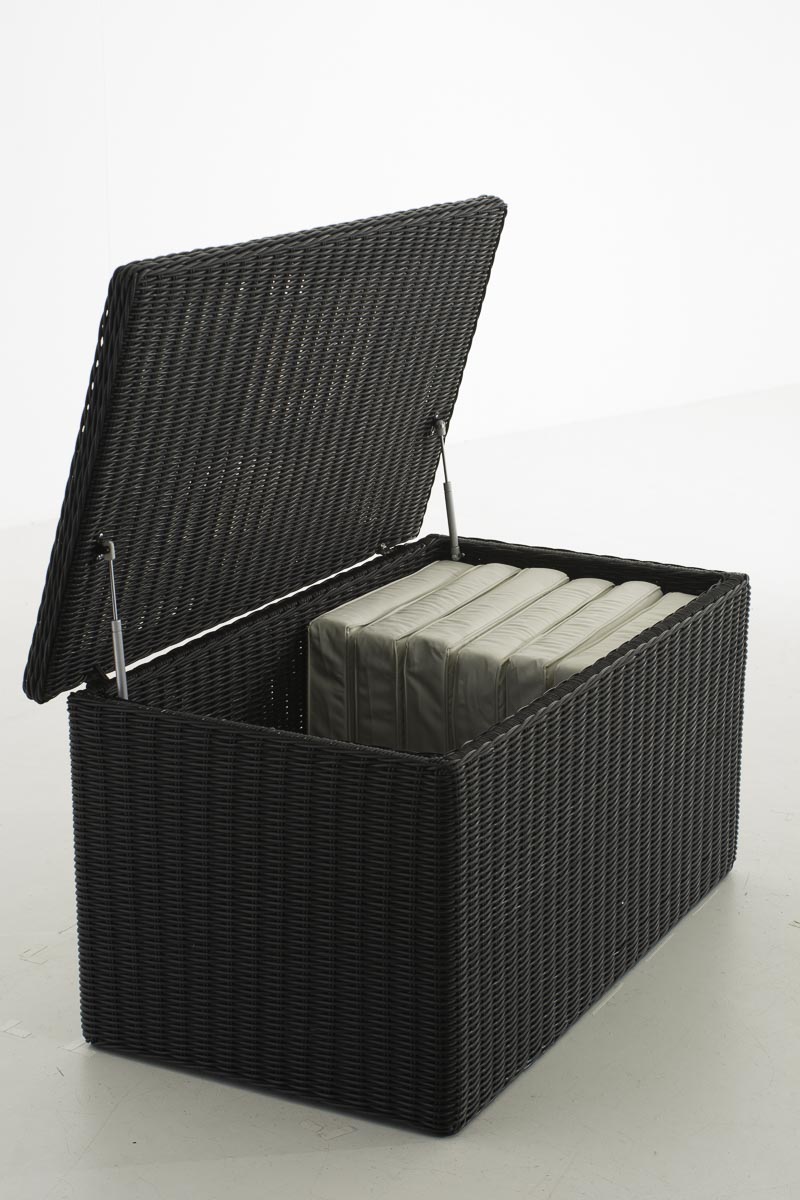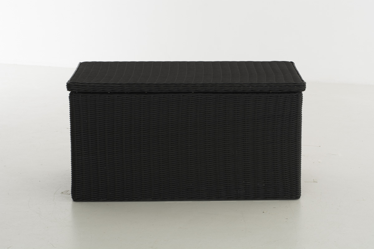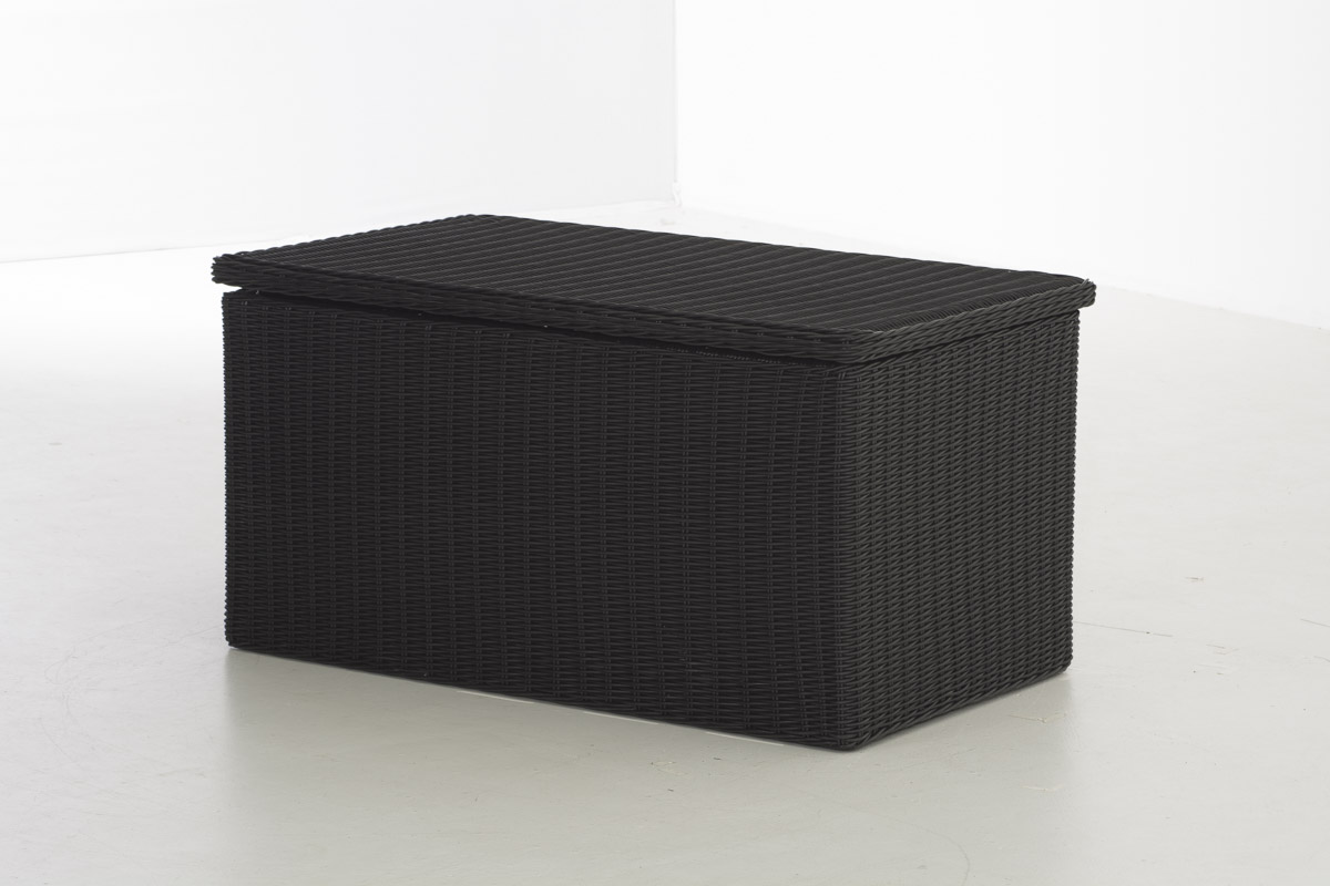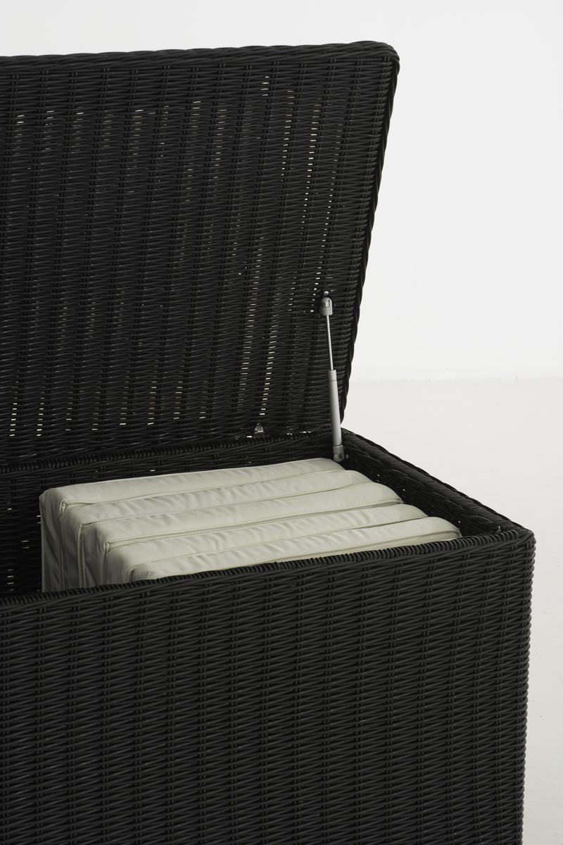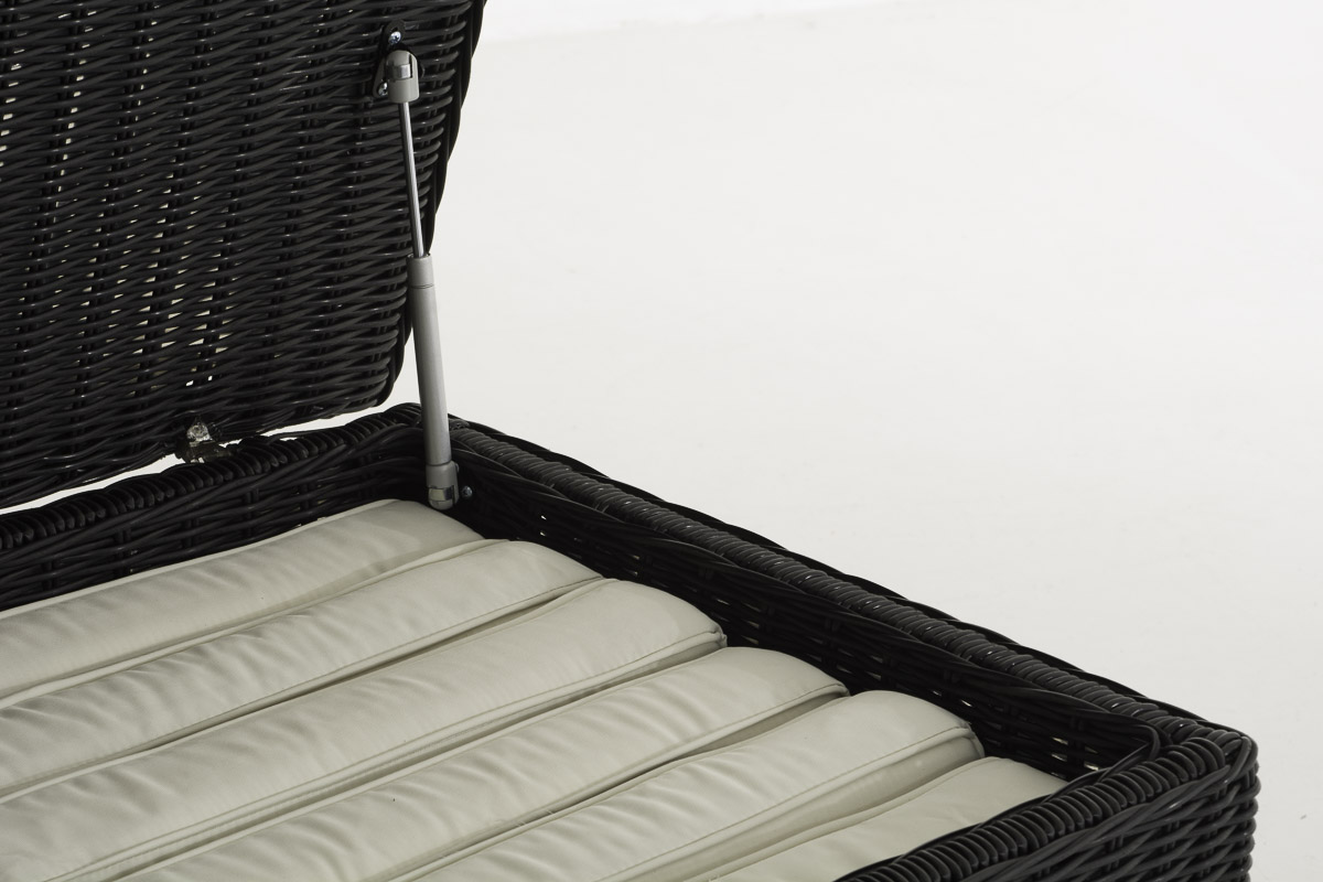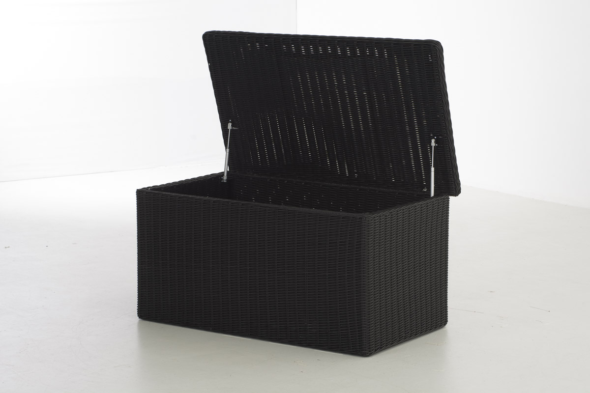 Diese Aufbewahrungsbox ist eine edle und funktionale Truhe für Ihre Gartentextilien. Die Box ist aus dickem Polyrattangeflecht zweifach geflochten und mit einem Gestell aus pulverbeschichtetem Aluminium versehen. Aluminium ist besonders robust und langlebig. Es rostet nicht und schützt das Gartenmöbel zudem vor Witterungs- und Korrosionsschäden. In dem beidseitig geflochtenem Deckel ist eine Folie eingearbeitet die den Inhalt von oben vor Nässe schützt. Bitte beachten Sie dass diese nicht im übrigen Torso vorhanden und der Artikel somit nicht Wasserdicht ist. Die Box lässt sich durch einen oben angebrachten Deckel einfach öffnen und schließen. Für praktische Unterstützung und zusätzliche Stabilität sorgen zudem die beiden Gasliftdämpfer am Deckel der Box – sanftes Öffnen und Schließen ist garantiert.