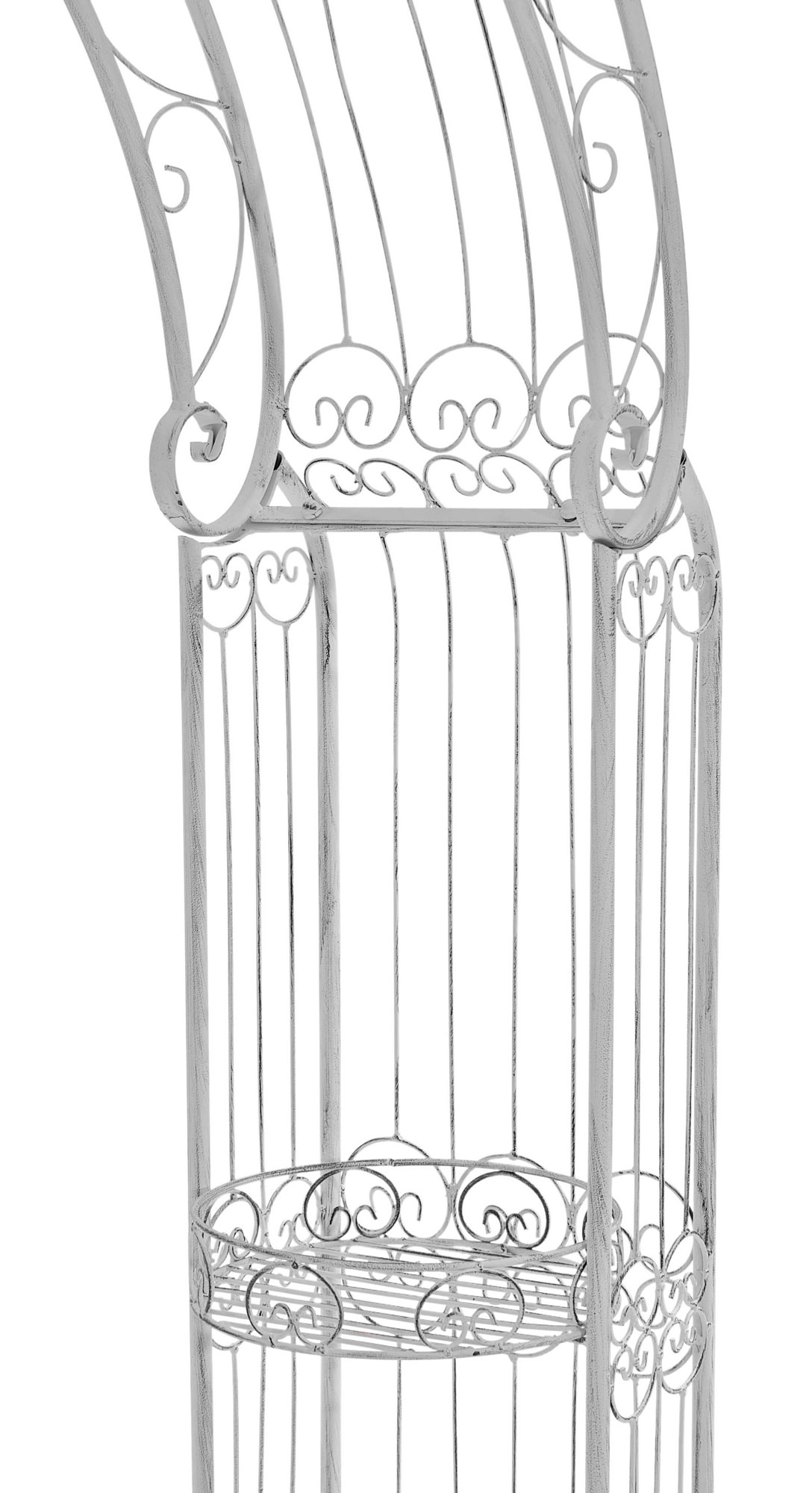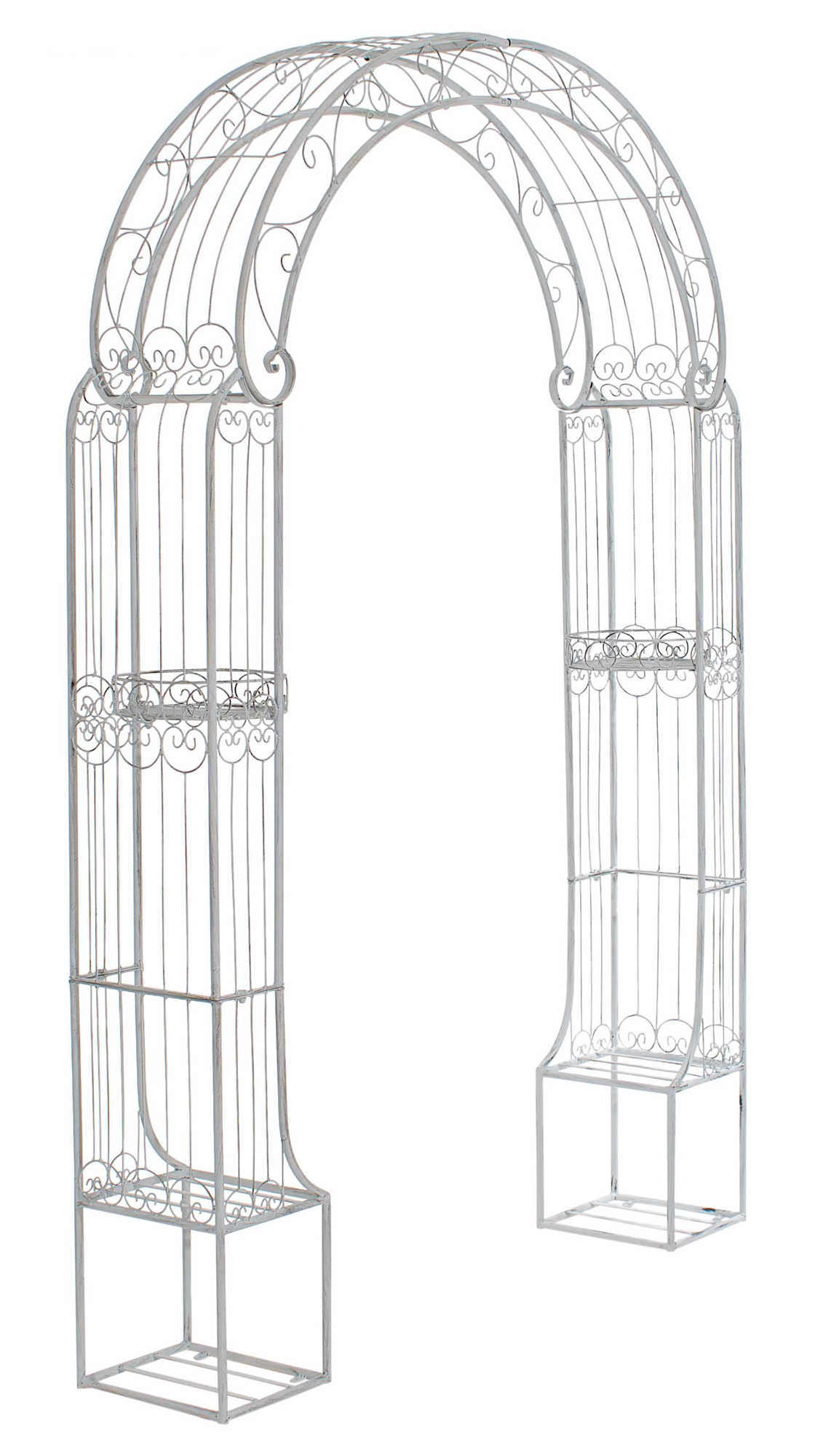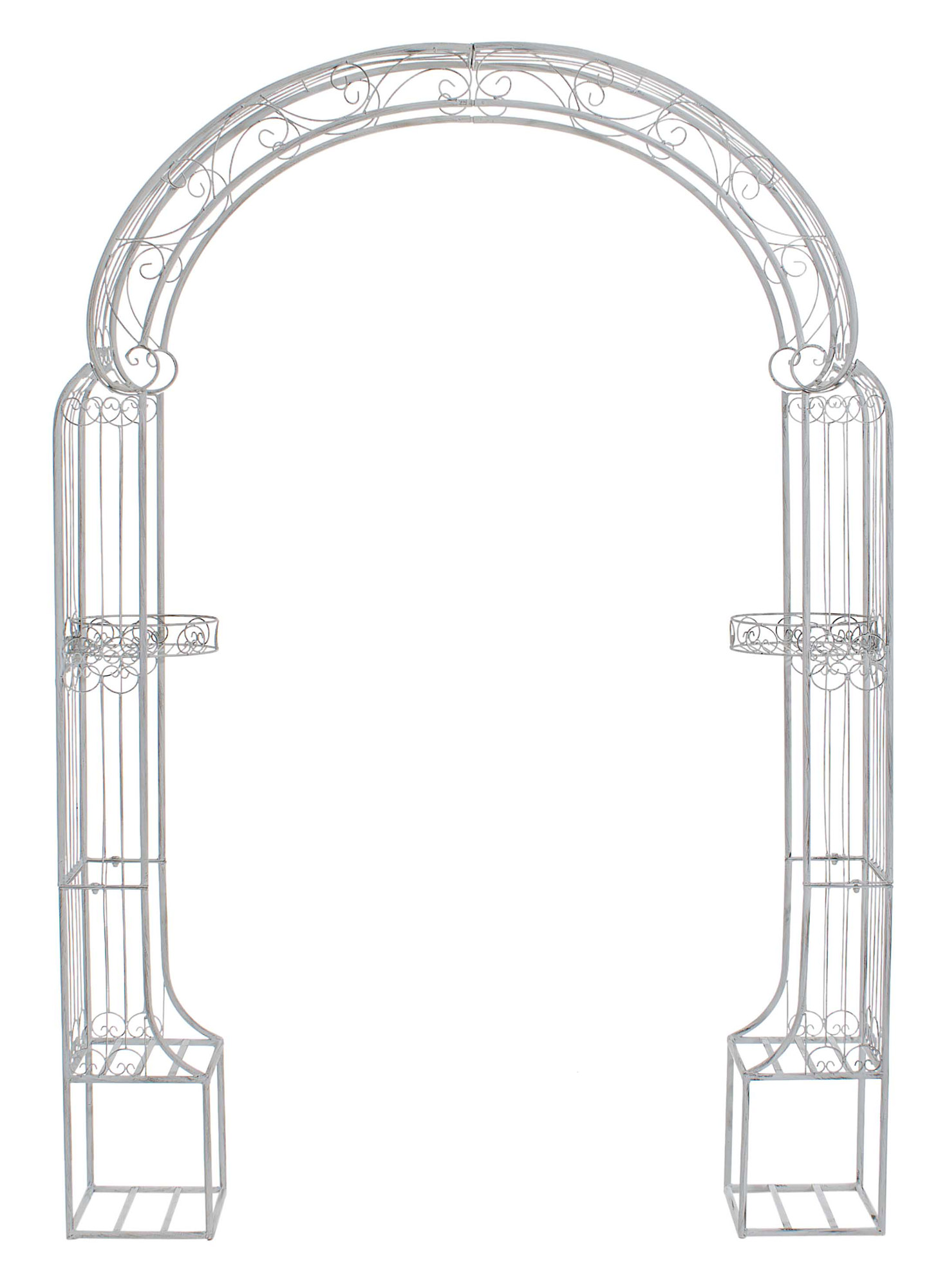 Exklusiver Rosenbogen aus pulverbeschichtetem Eisen. Dieser Bogen hat ein elegantes Design und ist die ideale Rankhilfe für alle Rankpflanzen, wie z.B. Rosen oder Efeu. Er besticht nicht nur durch sein elegantes Design, sondern besitzt auch noch insgesamt vier Abstellmöglichkeiten z.B. für weitere Pflanzen oder andere schöne Dekoideen. Zur Befestigung dienen insgesamt acht vorgefertigte Löcher im Fuß des Rosenbogen. Hiermit kann der Rosenbogen leicht und schnell am Boden standsicher fixiert werden.