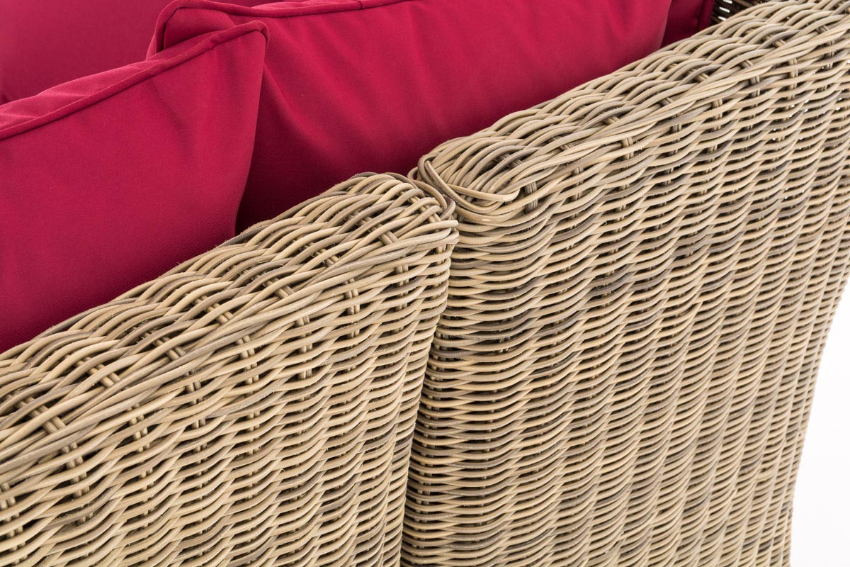 Das besonders gut für die Verwendung im Außenbereich geeignete UV-beständige Material Polyrattan sieht aus wie herkömmliches Rattangeflecht, ist aber viel robuster. Die hochwertig verarbeiteten 5 mm dicken, runden Polyrattanfasern sind wasserfest, angenehm pflegeleicht und UV-beständig, sodass sie auch bei häufiger und langjähriger Nutzung unverändert ihre Farbtiefe behalten. Dieser edle Farbton sorgt in Kombination mit einer leichten Struktur für das absolut natürliche Erscheinungsbild dieser Möbelgarnitur.